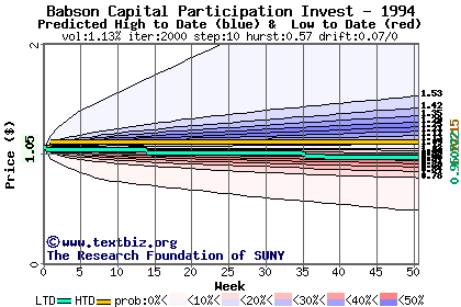 The high to date and low to date prices of the stock plotted against a random walk model for 1994 (what's this?).