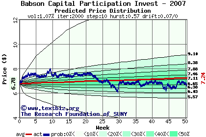 The high to date and low to date prices of the stock plotted against a random walk model for 2007 (what's this?).