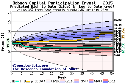 The high to date and low to date prices of the stock plotted against a random walk model for 2015 (what's this?).