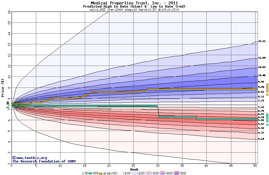 The high to date and low to date prices of the stock plotted against a random walk model for 2011 (what's this?).
