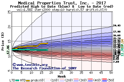 The high to date and low to date prices of the stock plotted against a random walk model for 2017 (what's this?).