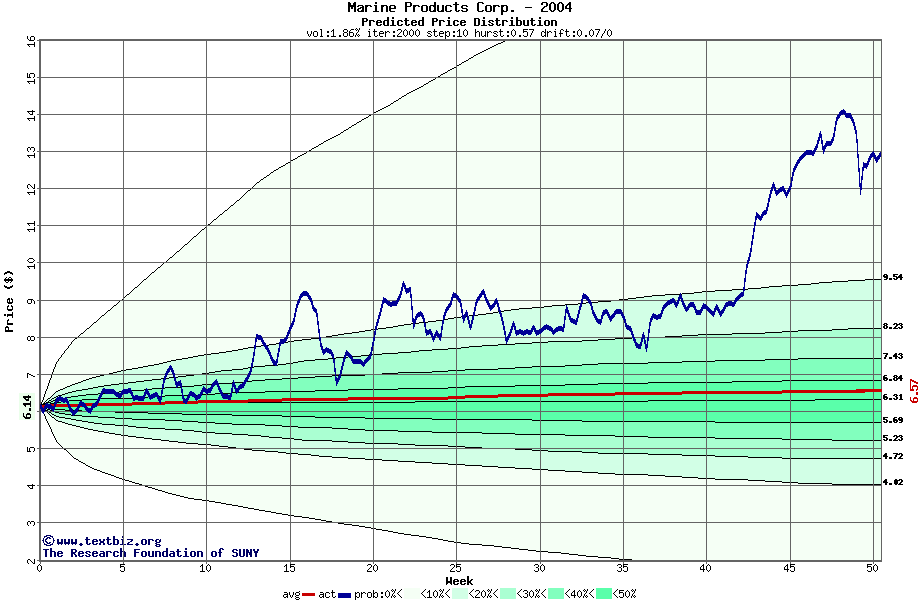 The following graph plots the year-to-date performance of the stock for 2004 compared to the probability calculated by a random walk model.