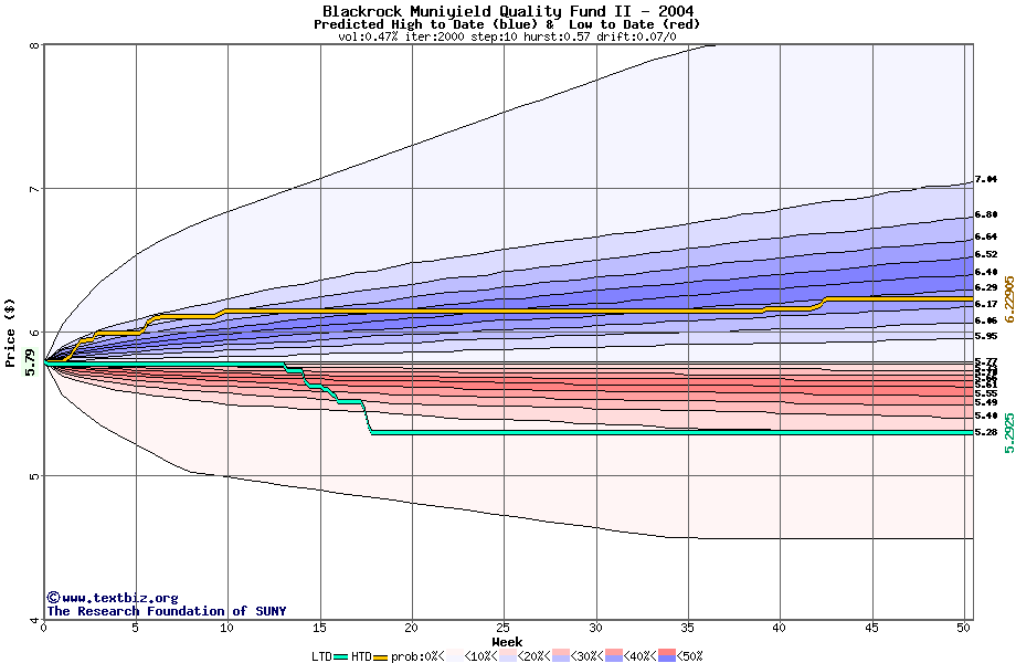 The high to date and low to date prices of the stock plotted against a random walk model for 2004 (what's this?).