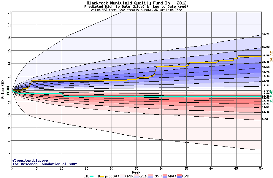 The high to date and low to date prices of the stock plotted against a random walk model for 2012 (what's this?).