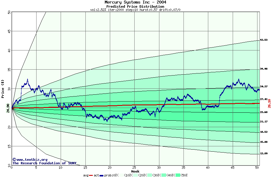 The following graph plots the year-to-date performance of the stock for 2004 compared to the probability calculated by a random walk model.