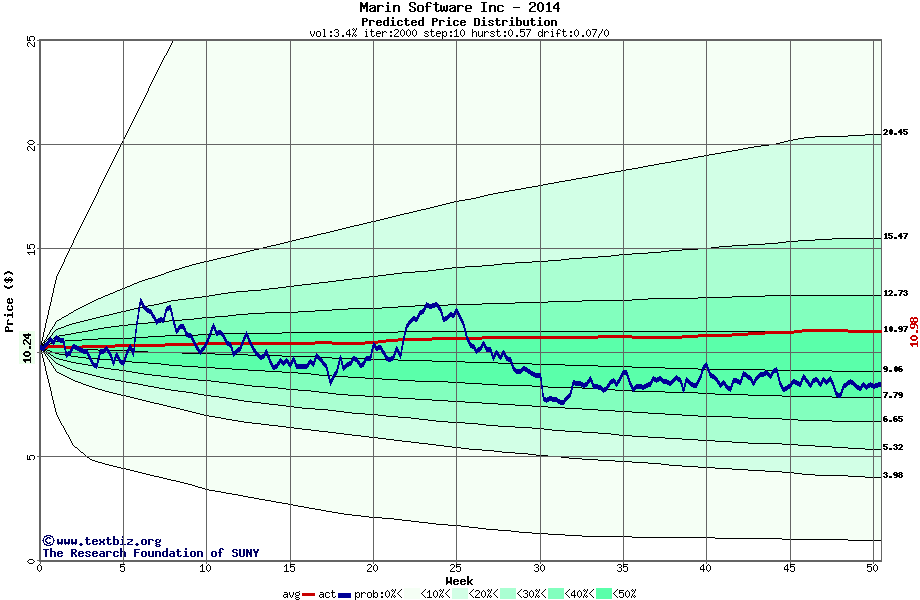 The following graph plots the year-to-date performance of the stock for 2014 compared to the probability calculated by a random walk model.