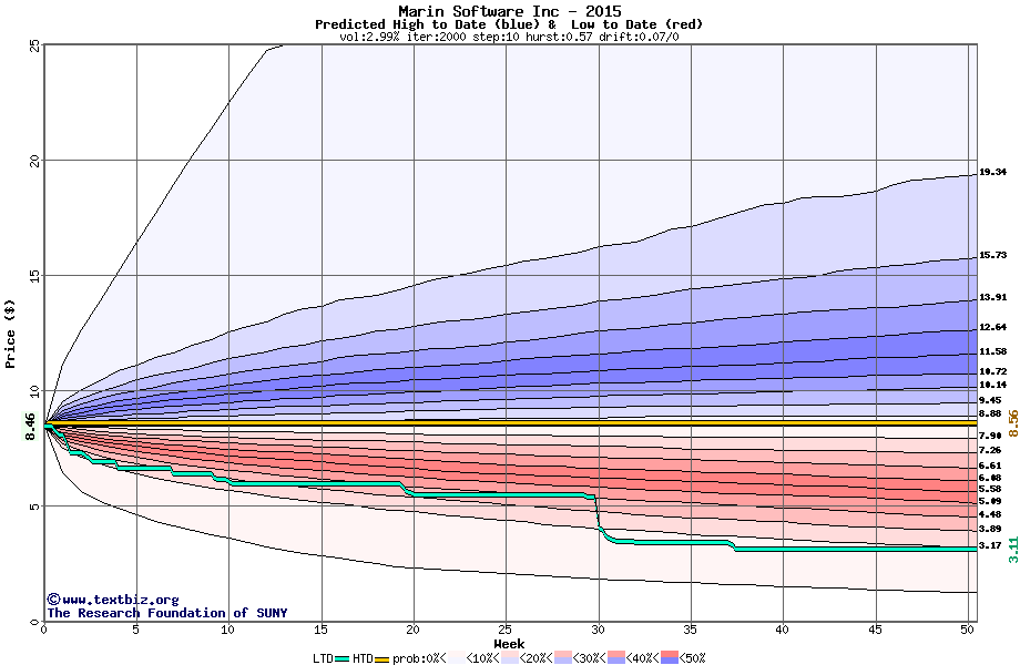 The high to date and low to date prices of the stock plotted against a random walk model for 2015 (what's this?).