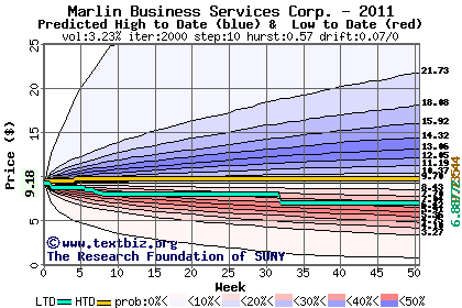 The high to date and low to date prices of the stock plotted against a random walk model for 2011 (what's this?).