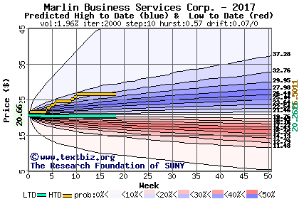 The high to date and low to date prices of the stock plotted against a random walk model for 2017 (what's this?).