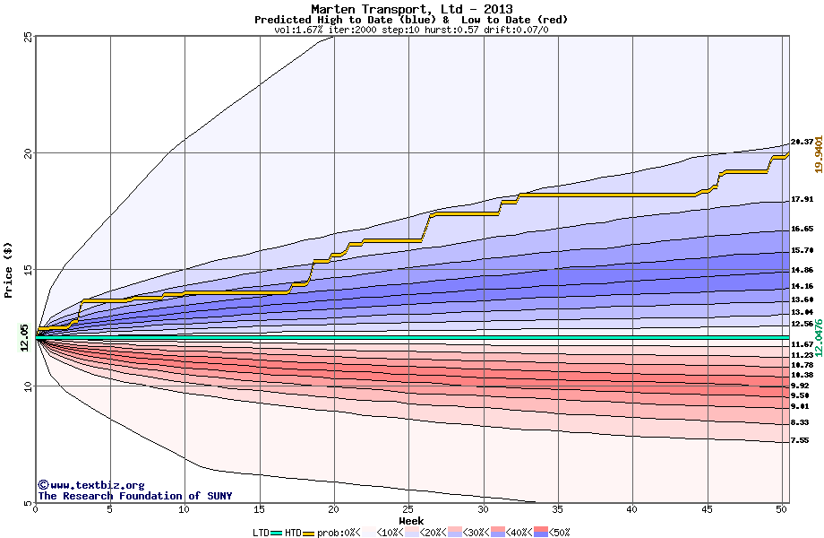 The high to date and low to date prices of the stock plotted against a random walk model for 2013 (what's this?).
