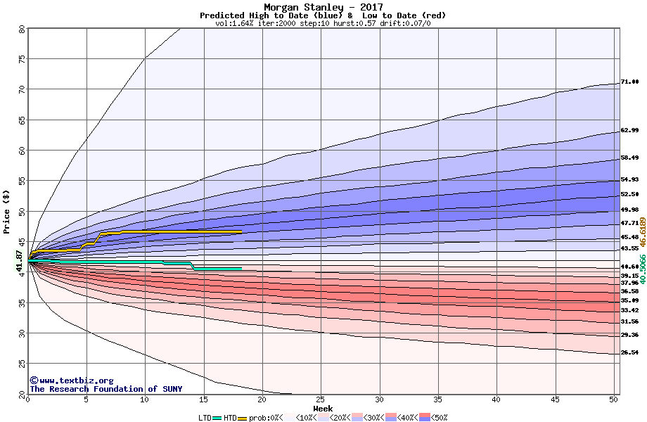 The high to date and low to date prices of the stock plotted against a random walk model for 2017 (what's this?).