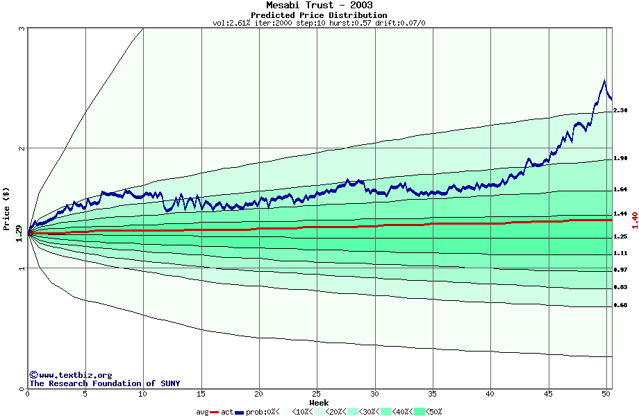 The high to date and low to date prices of the stock plotted against a random walk model for 2003 (what's this?).