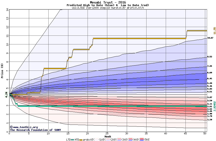 The high to date and low to date prices of the stock plotted against a random walk model for 2016 (what's this?).