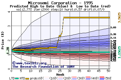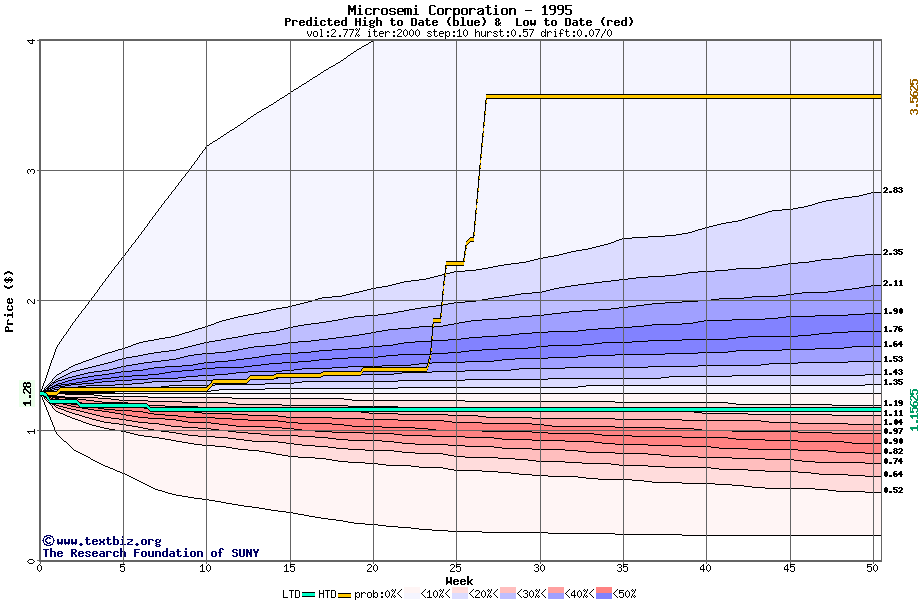 The high to date and low to date prices of the stock plotted against a random walk model for 1995 (what's this?).