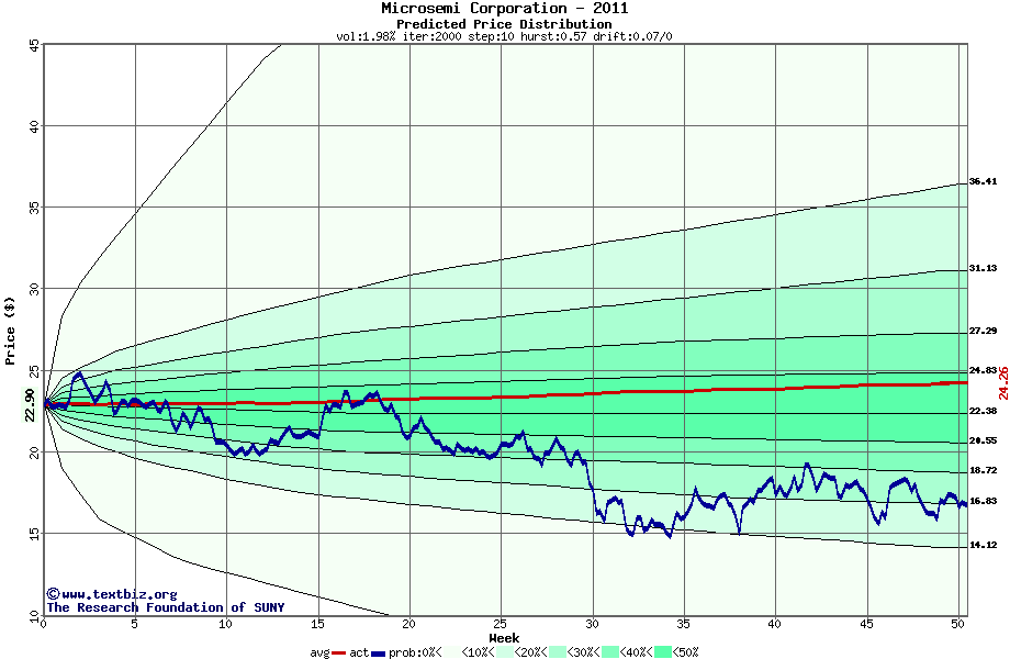 The following graph plots the year-to-date performance of the stock for 2011 compared to the probability calculated by a random walk model.