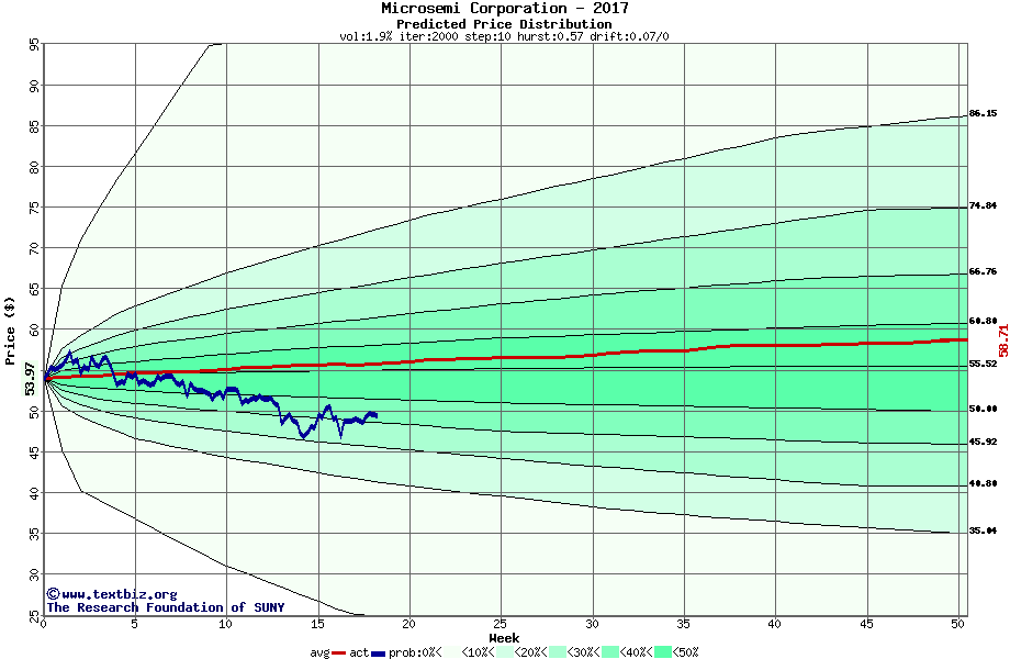 The following graph plots the year-to-date performance of the stock for 2017 compared to the probability calculated by a random walk model.