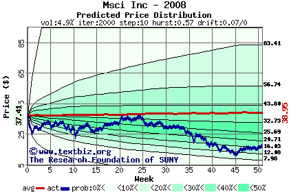 The following graph plots the year-to-date performance of the stock for 2008 compared to the probability calculated by a random walk model.