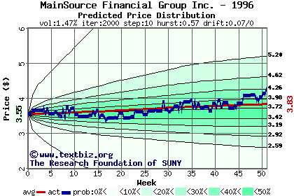 The high to date and low to date prices of the stock plotted against a random walk model for 1996 (what's this?).