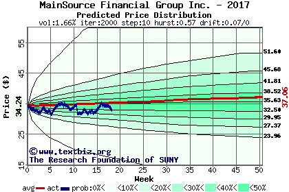 The high to date and low to date prices of the stock plotted against a random walk model for 2017 (what's this?).