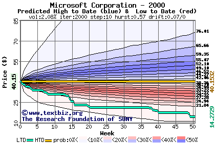 The high to date and low to date prices of the stock plotted against a random walk model for 2000 (what's this?).
