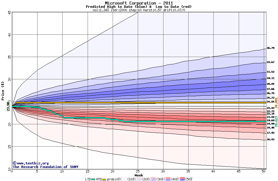 The high to date and low to date prices of the stock plotted against a random walk model for 2011 (what's this?).