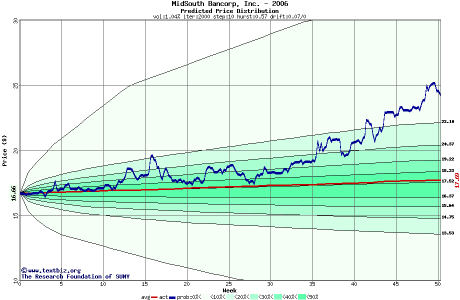 The following graph plots the year-to-date performance of the stock for 2006 compared to the probability calculated by a random walk model.