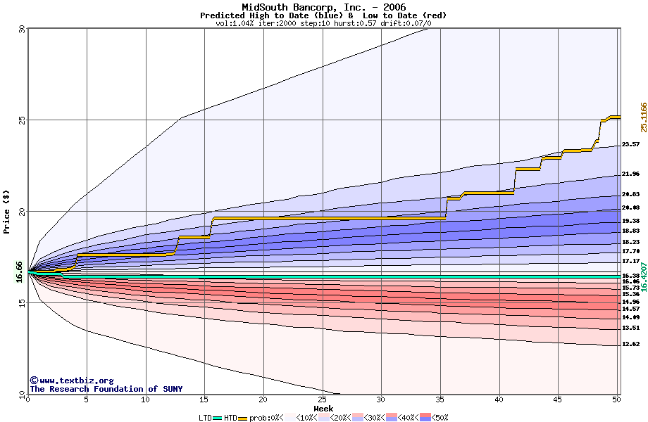 The high to date and low to date prices of the stock plotted against a random walk model for 2006 (what's this?).