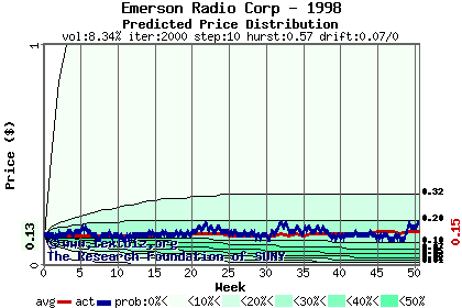 The high to date and low to date prices of the stock plotted against a random walk model for 1998 (what's this?).
