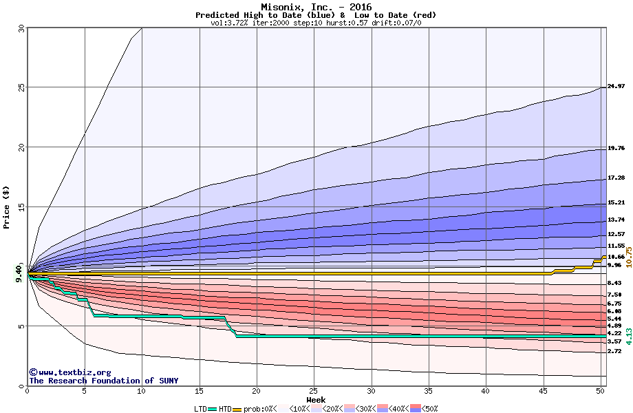 The high to date and low to date prices of the stock plotted against a random walk model for 2016 (what's this?).
