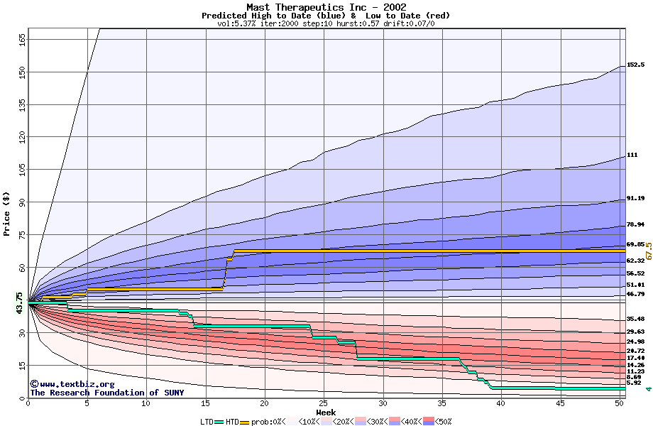 The high to date and low to date prices of the stock plotted against a random walk model for 2002 (what's this?).