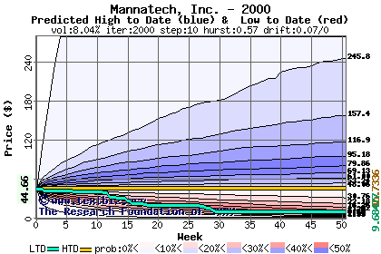 The high to date and low to date prices of the stock plotted against a random walk model for 2000 (what's this?).