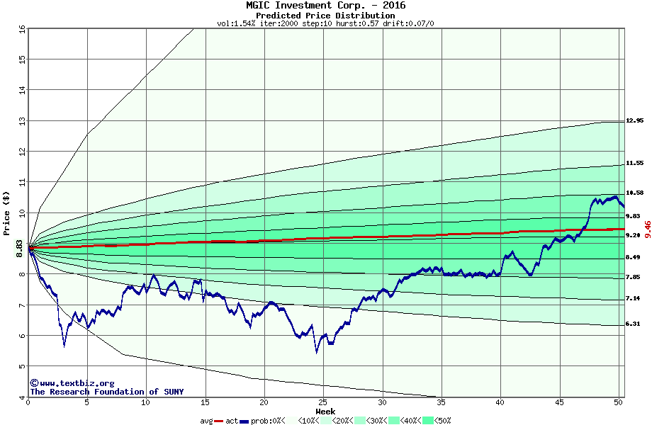 The following graph plots the year-to-date performance of the stock for 2016 compared to the probability calculated by a random walk model.