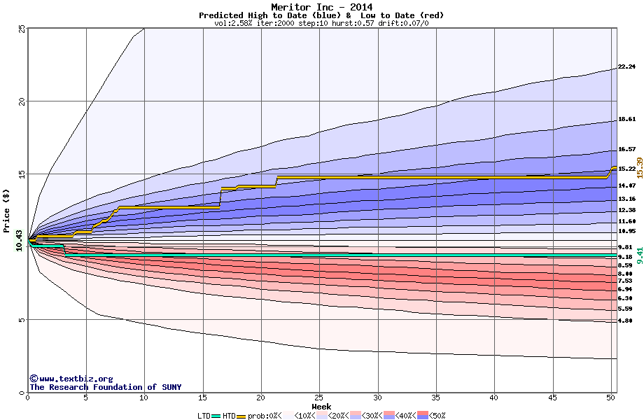 The high to date and low to date prices of the stock plotted against a random walk model for 2014 (what's this?).