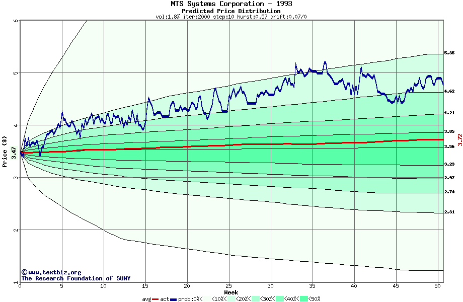 The following graph plots the year-to-date performance of the stock for 1993 compared to the probability calculated by a random walk model.