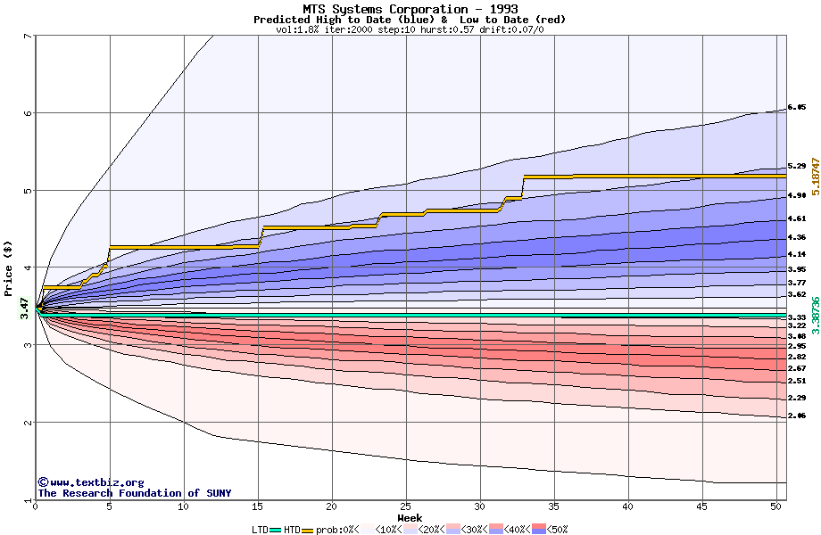 The high to date and low to date prices of the stock plotted against a random walk model for 1993 (what's this?).