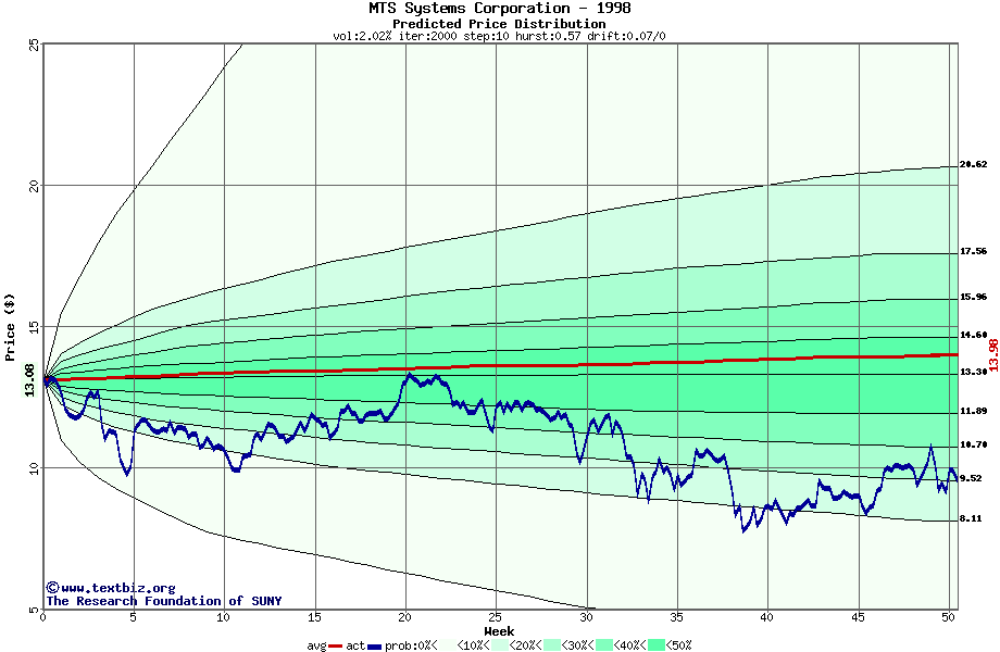 The following graph plots the year-to-date performance of the stock for 1998 compared to the probability calculated by a random walk model.