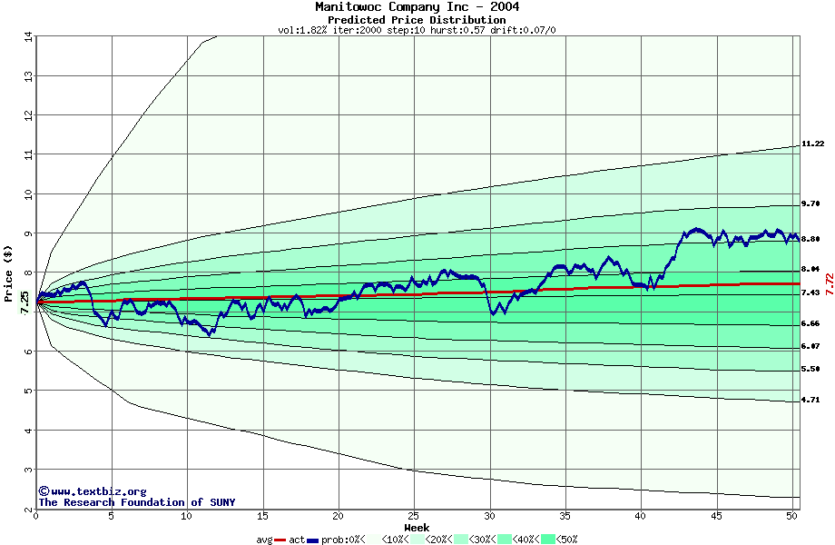 The following graph plots the year-to-date performance of the stock for 2004 compared to the probability calculated by a random walk model.
