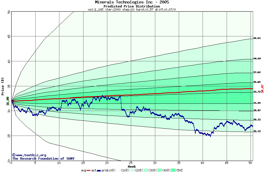 The following graph plots the year-to-date performance of the stock for 2005 compared to the probability calculated by a random walk model.