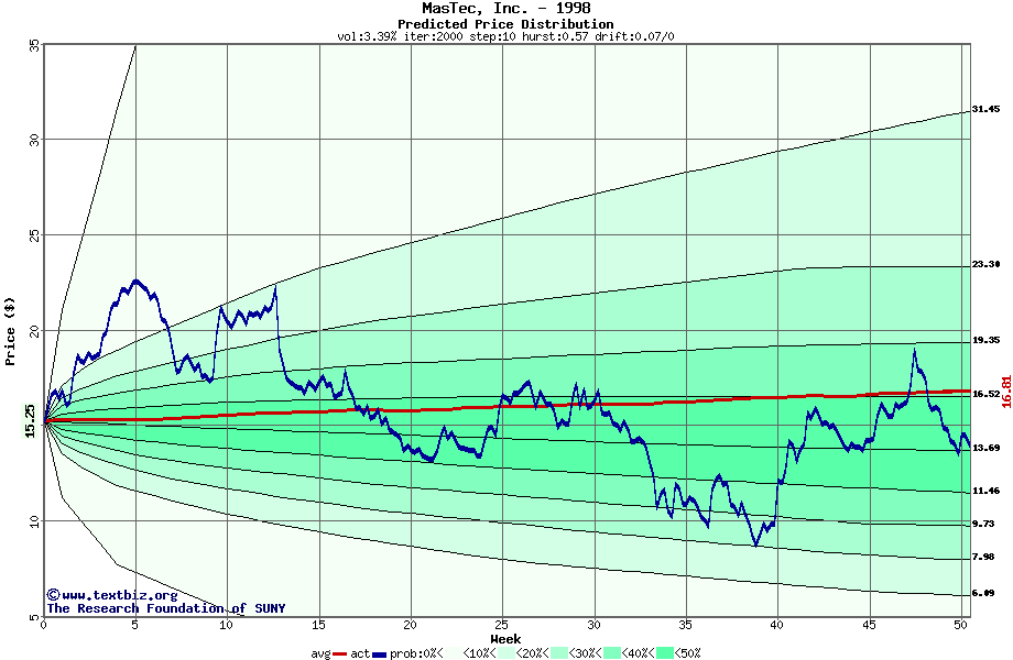 The following graph plots the year-to-date performance of the stock for 1998 compared to the probability calculated by a random walk model.