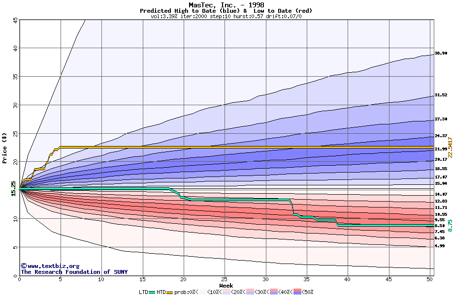 The high to date and low to date prices of the stock plotted against a random walk model for 1998 (what's this?).