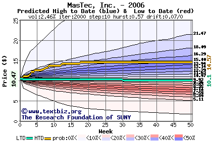 The high to date and low to date prices of the stock plotted against a random walk model for 2006 (what's this?).