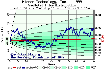 The high to date and low to date prices of the stock plotted against a random walk model for 1999 (what's this?).