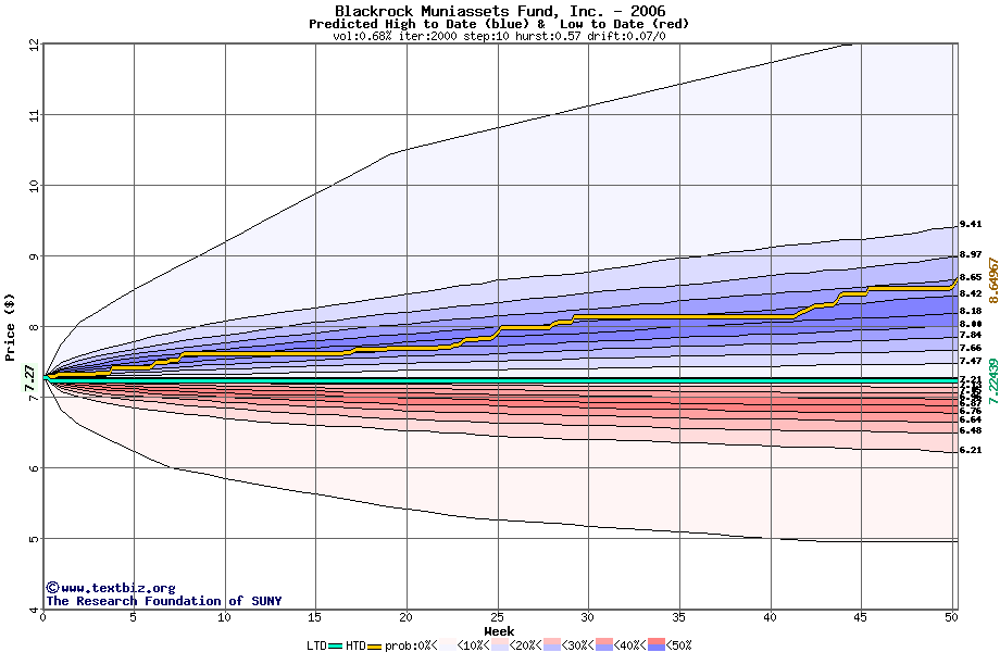 The high to date and low to date prices of the stock plotted against a random walk model for 2006 (what's this?).