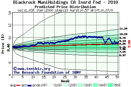 The high to date and low to date prices of the stock plotted against a random walk model for 2010 (what's this?).