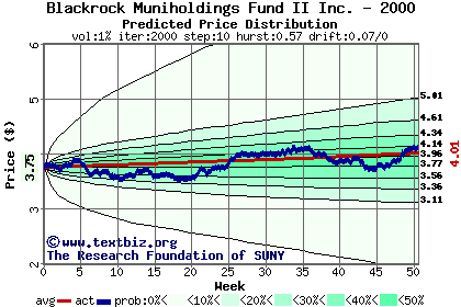 The high to date and low to date prices of the stock plotted against a random walk model for 2000 (what's this?).