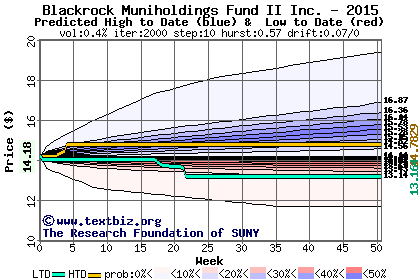 The high to date and low to date prices of the stock plotted against a random walk model for 2015 (what's this?).