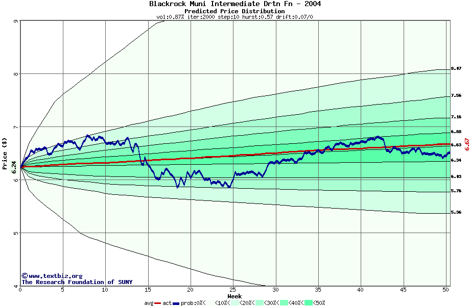 The high to date and low to date prices of the stock plotted against a random walk model for 2004 (what's this?).