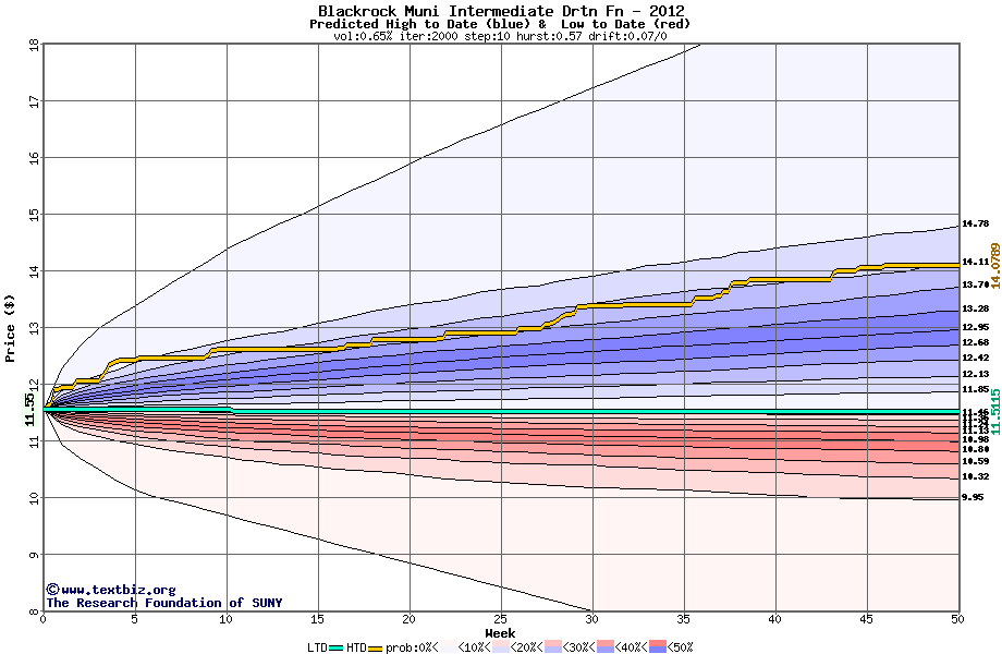 The high to date and low to date prices of the stock plotted against a random walk model for 2012 (what's this?).
