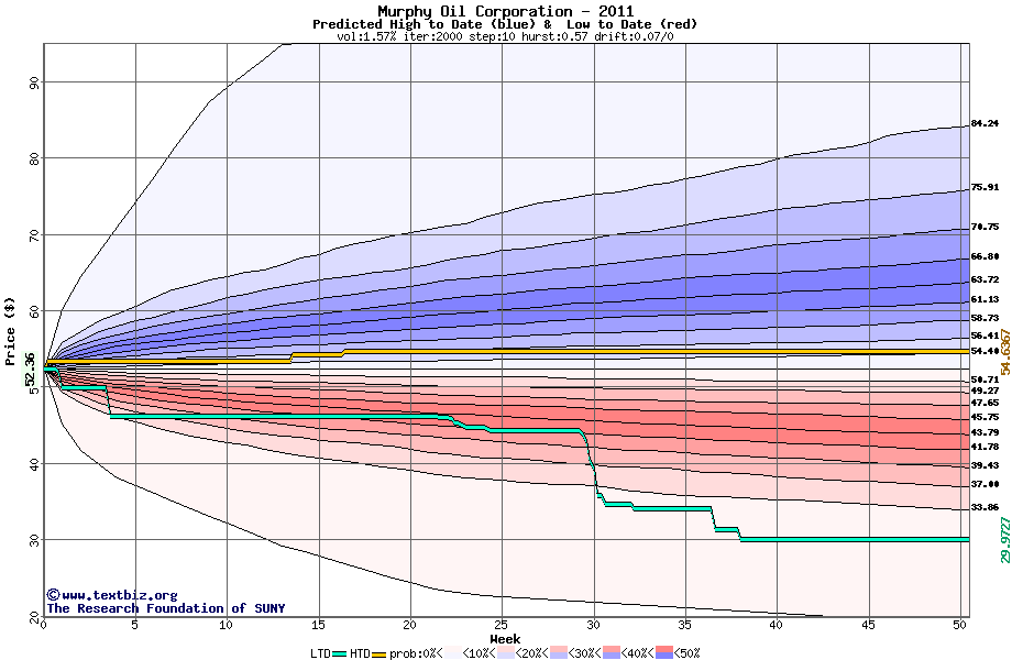 The high to date and low to date prices of the stock plotted against a random walk model for 2011 (what's this?).