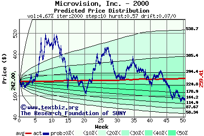 The high to date and low to date prices of the stock plotted against a random walk model for 2000 (what's this?).